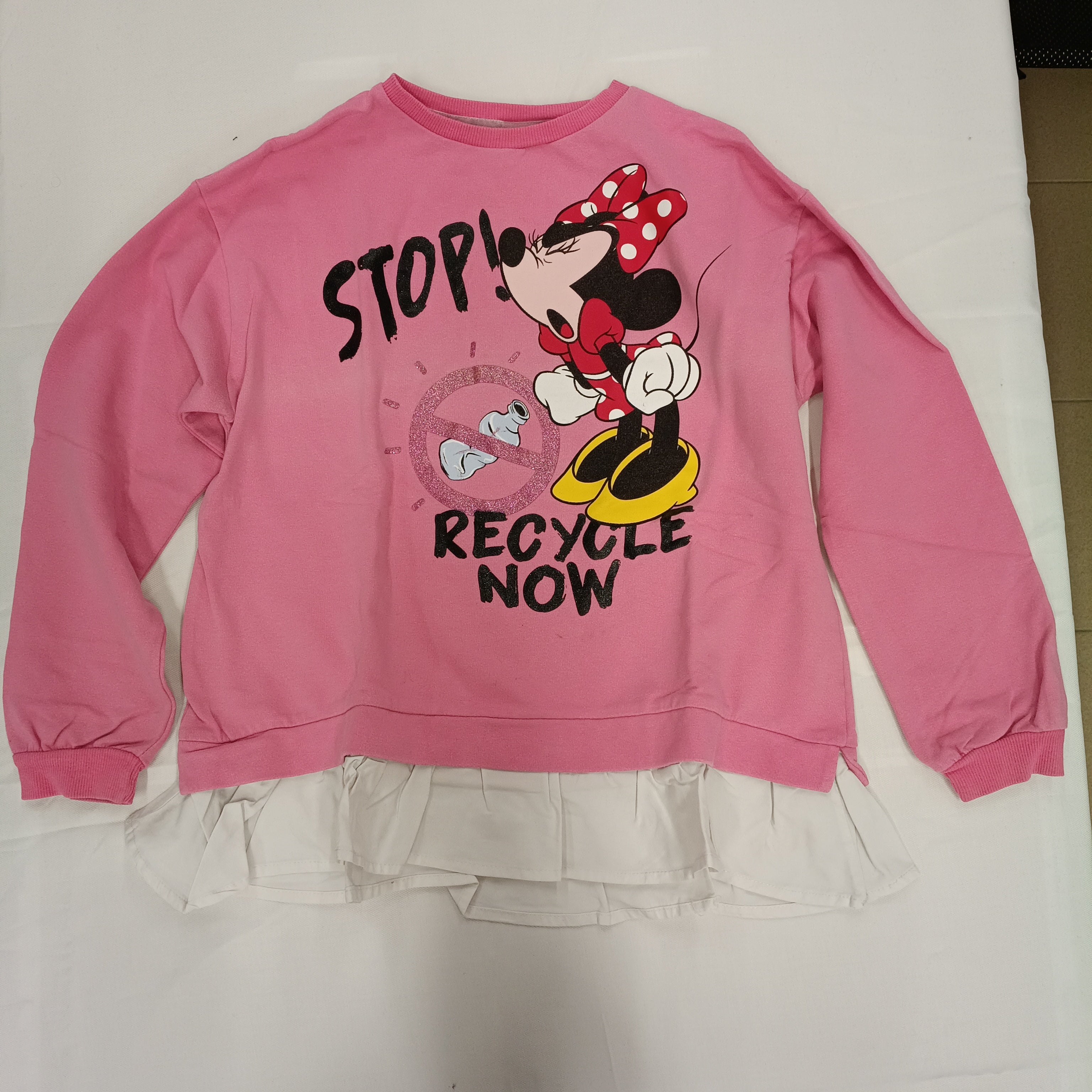 Aggiungi un tocco di magia al guardaroba della tua piccola con questo meraviglioso maglione di Minnie Mouse! Realizzato in un morbido tessuto rosa, questo pullover presenta un divertente design con Minnie che invita a "RECICLARE ORA", promuovendo un messaggio importante in modo giocoso. La parte inferiore è arricchita da una graziosa balza bianca, che dona un effetto romantico e trendy. Le maniche lunghe e il taglio comodo lo rendono perfetto per le giornate fresche, sia per la scuola che per momenti di svago. Nonostante sia un capo usato, è in ottime condizioni e pronto per essere indossato da una piccola amante dello stile e dell'ambiente!