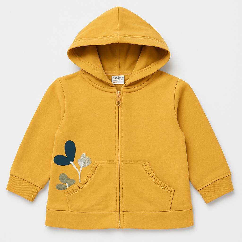 Questo adorabile giubbino giallo di marca prende ispirazione dalla natura! Realizzato in morbido cotone, è perfetto per le fresche giornate primaverili o autunnali. La chiusura con zip e il cappuccio offrono comfort e calore, mentre le tasche laterali sono pratiche per riporre piccoli tesori. Decorato con dettagli floreali in tessuto, questo giubbino unisce stile e praticità, rendendo ogni outfit più vivace e giocoso. Nonostante sia un capo usato, si presenta in ottime condizioni, pronto a far esplorare il mondo a piccole avventuriere!