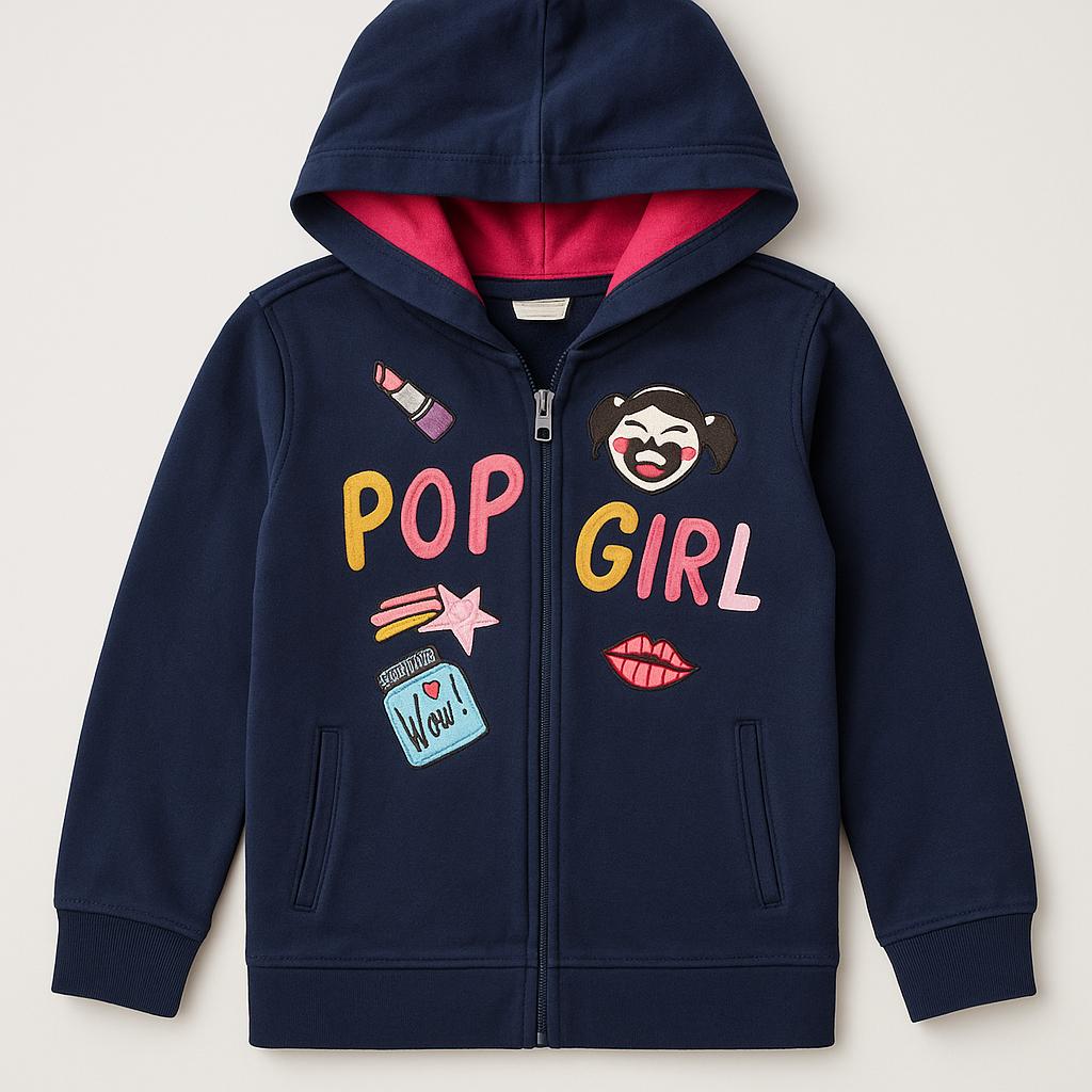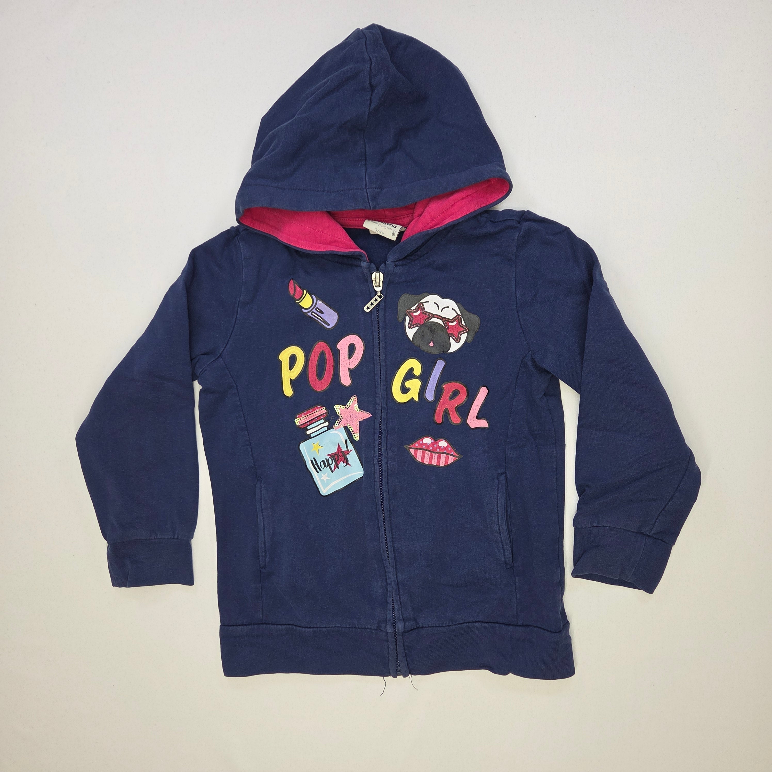 Questa fantastica felpa con cappuccio blu marino è perfetta per le piccole fashioniste! Con la sua zip frontale e un morbido interno in cotone, offre comfort e calore. Decori colorati, come "POP GIRL", pochette e labbra rosse, rendono questo capo pieno di personalità e stile. Le maniche lunghe garantiscono protezione durante le fresche serate estive o durante le avventure quotidiane. Usata ma in ottime condizioni, questa felpa è ideale per ogni guardaroba giovane, aggiungendo quel tocco di creatività e divertimento!