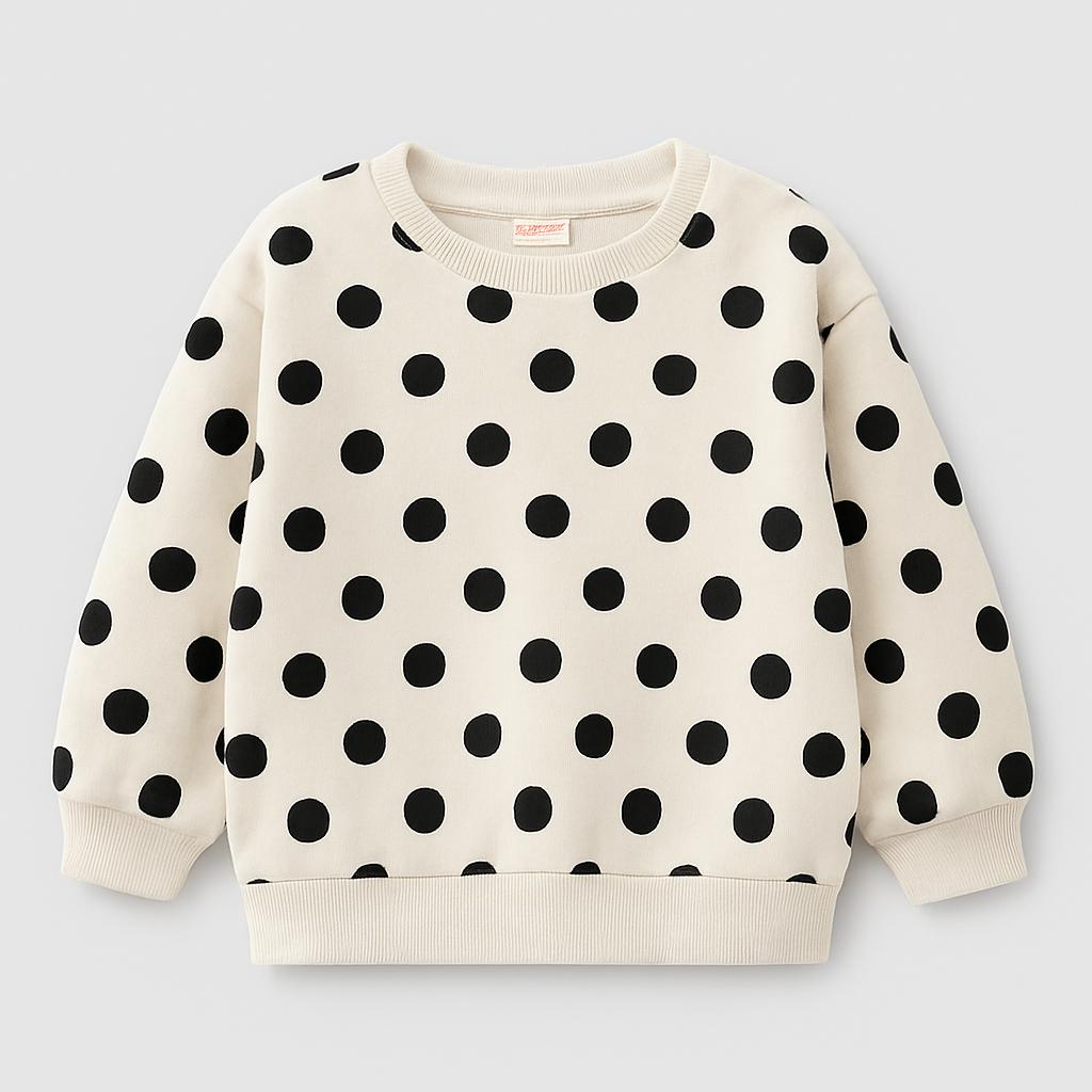 Questo adorabile pullover a pois è l'ideale per le piccole fashioniste! Realizzato in un morbido tessuto di cotone, presenta un delicato sfondo chiaro adornato da grandi pois neri che catturano l'attenzione. Il taglio comodo e le maniche a palloncino garantiscono libertà di movimento, rendendolo perfetto per giocare e divertirsi. Nonostante sia un capo usato, è in ottime condizioni e pronto a regalare calore e stile nelle giornate fresche. Aggiungi un tocco di allegria al guardaroba della tua bimba con questo pullover irresistibile!