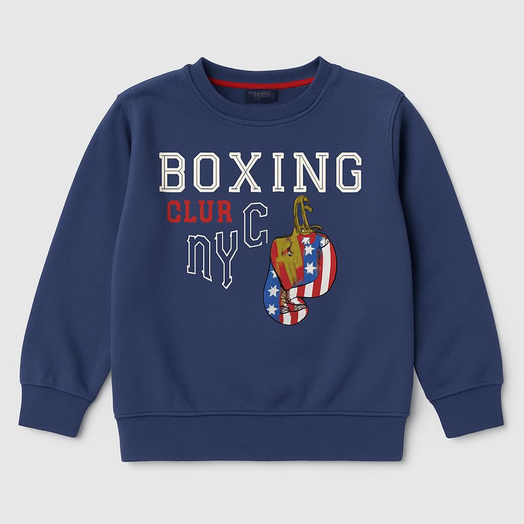 Questo accogliente pullover di marca "Boxing Club NYC" è perfetto per i piccoli amanti dell'avventura! Realizzato in morbido cotone, il suo colore blu profondo lo rende versatile e facile da abbinare. Sul fronte, una vivace grafica con bandiere e scritte in stile sportivo aggiunge un tocco di energia e carattere. Le maniche svasate e il taglio comodo garantiscono libertà di movimento e comfort, ideali per giochi e attività quotidiane. Nonostante sia usato, il pullover è in buone condizioni e pronto per rendere felice il tuo bambino con uno stile casual e dinamico!