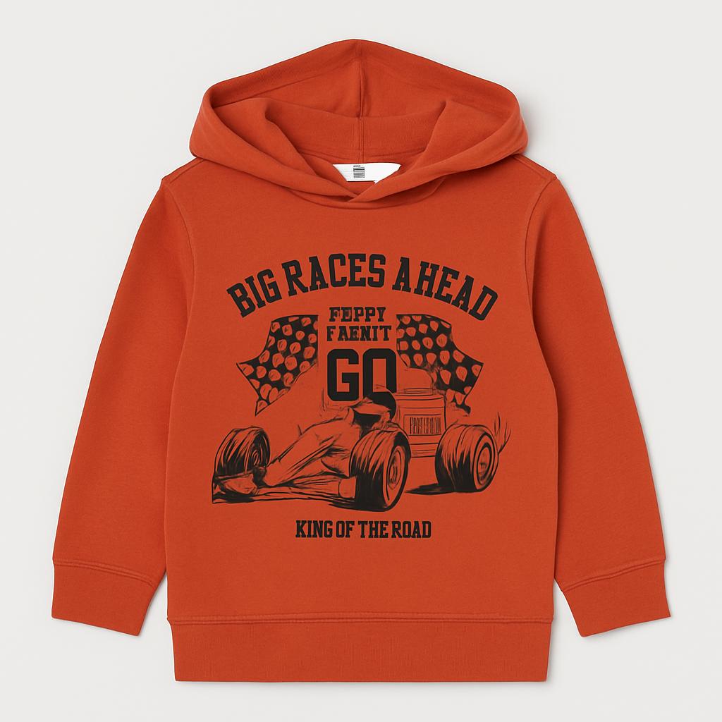 Preparati a sfrecciare con questo fantastico felpa con cappuccio! Realizzato in un caldo e morbido tessuto, il suo colore arancione rende ogni giorno una corsa avvincente. Sul davanti, un divertente motivo con un’auto da corsa e la scritta “BIG RACES AHEAD” incita all’avventura. Le maniche lunghe garantiscono comfort e calore, perfetta per le giornate fresche o per le uscite con gli amici. Questo capo usato è in ottime condizioni e sarà amato dai piccoli piloti del tuo cuore! Ideale per un look sportivo e dinamico!