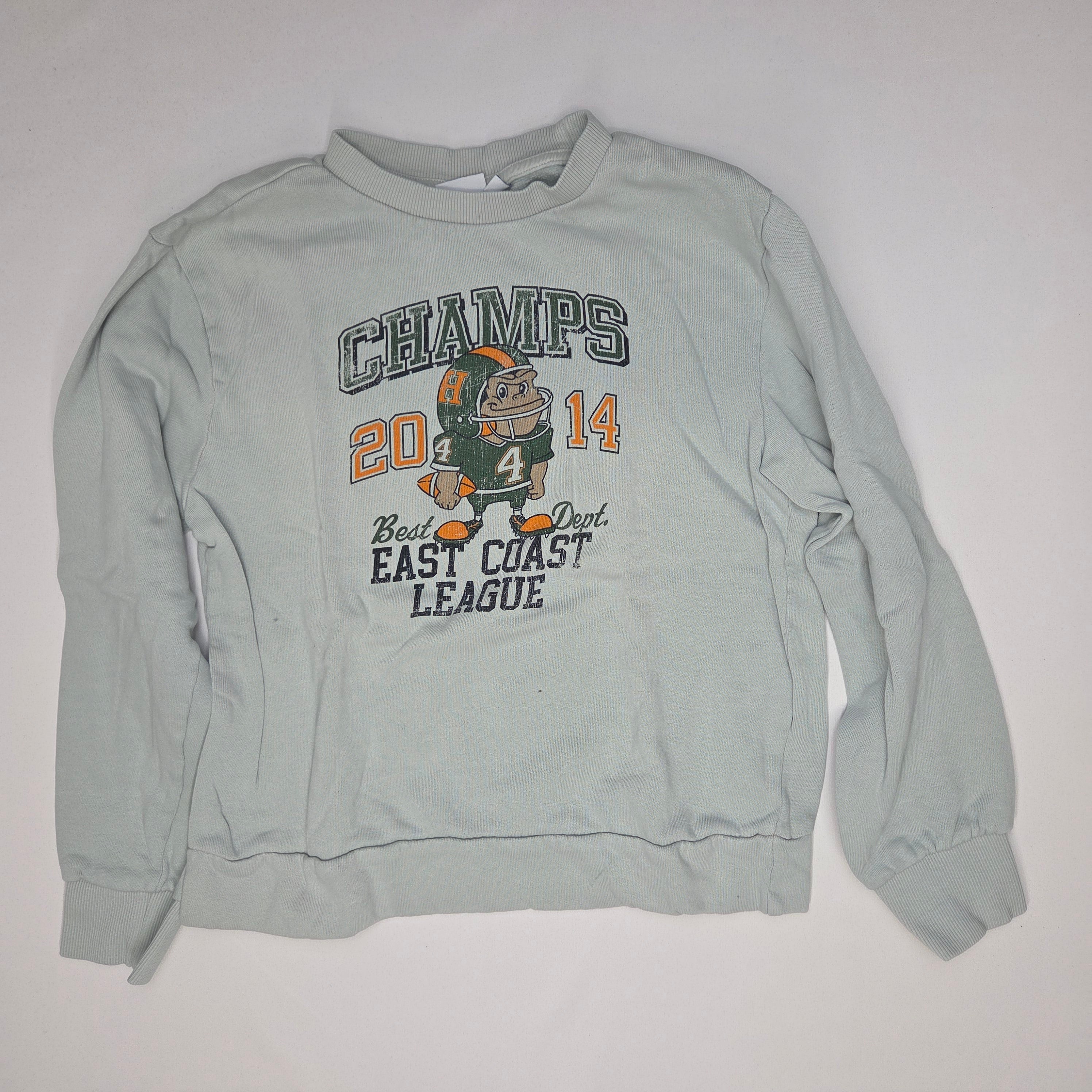 Questo delizioso pullover grigio chiaro è perfetto per i piccoli sportivi! Con uno stile informale, presenta un divertente stampato centrale che celebra con orgoglio il "Champs 2014" in un'atmosfera giocosa. Le maniche lunghe lo rendono ideale per le giornate fresche, perfetto per avventure all'aperto o momenti di relax a casa. Realizzato in una morbida miscela di materiali, offre comfort e calore. Nonostante sia un capo usato, è in ottime condizioni e pronto a regalare nuovi ricordi a un piccolo campione! Ideale per chi ama vestirsi con stile senza rinunciare alla comodità!