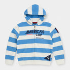 Questo splendido felpa con cappuccio di America’s Cup è perfetta per i piccoli esploratori! Realizzata in morbido cotone, presenta un design a righe bianche e azzurre che cattura l’attenzione. La chiusura frontale con zip e il cappuccio assicurano comfort e calore nelle fresche giornate. Il logo "AMERICA’S CUP" sul petto dona un tocco di avventura e sportività. Ideale per le passeggiate all'aria aperta o un look casual, questa felpa, pur essendo usata, è in ottime condizioni e pronta per essere indossata. Non lasciartela sfuggire!