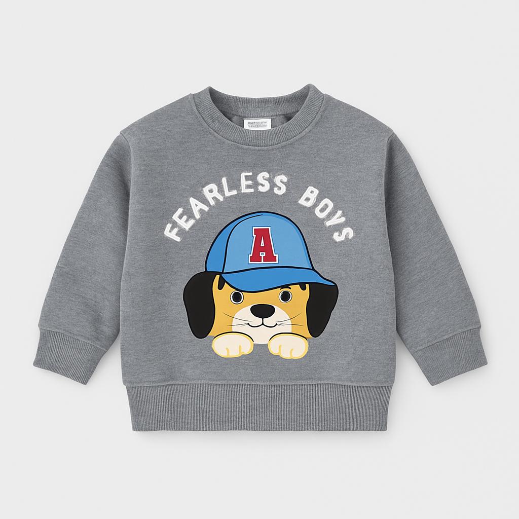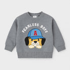 Questa simpatica felpa grigia è il compagno perfetto per i piccoli avventurieri! Con una dolce stampa di un cagnolino che indossa un cappellino, porta un messaggio di coraggio e divertimento con la scritta “FEARLESS BOYS”. Realizzata in un morbido tessuto, offre comfort e calore durante le fresche giornate. Le maniche lunghe e il collo leggermente alto rendono questo capo ideale per giochi all'aperto o per rilassarsi a casa. Nonostante sia usata, si presenta in ottime condizioni, pronta per far brillare il guardaroba del tuo bambino!