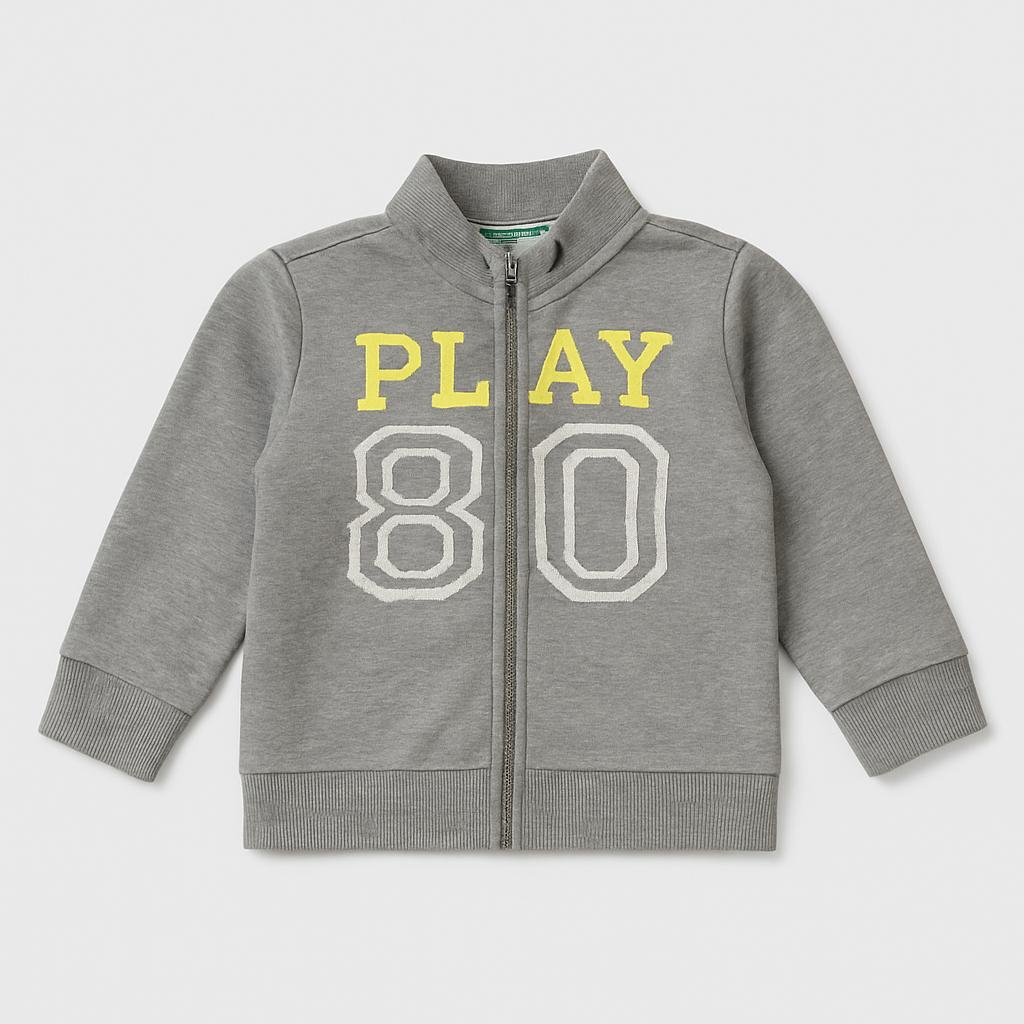 Questo adorabile zip-up in felpa grigia è perfetto per i piccoli esploratori! Con la scritta "PLAY" e il numero "80" in una vivace tonalità gialla, porta un tocco di energia e divertimento al guardaroba. Realizzato in morbido cotone, è confortevole e ideale per le giornate più fresche. Le maniche lunghe e il colletto alto garantiscono calore e stile, mentre la chiusura con zip rende facile indossarlo e toglierlo. Nonostante sia un capo usato, è in ottime condizioni e pronto per accompagnare le avventure della tua piccola stella!