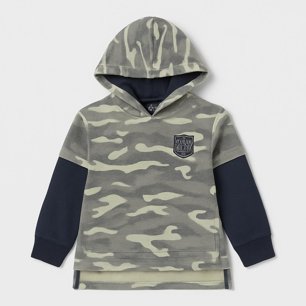 Questa simpatica felpa con cappuccio è perfetta per i piccoli esploratori! Realizzata in un caldo tessuto felpato, presenta un vivace motivo camouflage che farà sentire i bambini avventurosi e alla moda. Le maniche lunghe in blu scuro donano un contrasto accattivante e comfort, mentre la scritta "STAY COOL" sul petto aggiunge un tocco di personalità. Questa felpa, seppur usata, si trova in ottime condizioni, pronta ad accompagnare le giornate di gioco e le avventure all'aria aperta. Un capo versatile e trendy che non può mancare nel guardaroba!