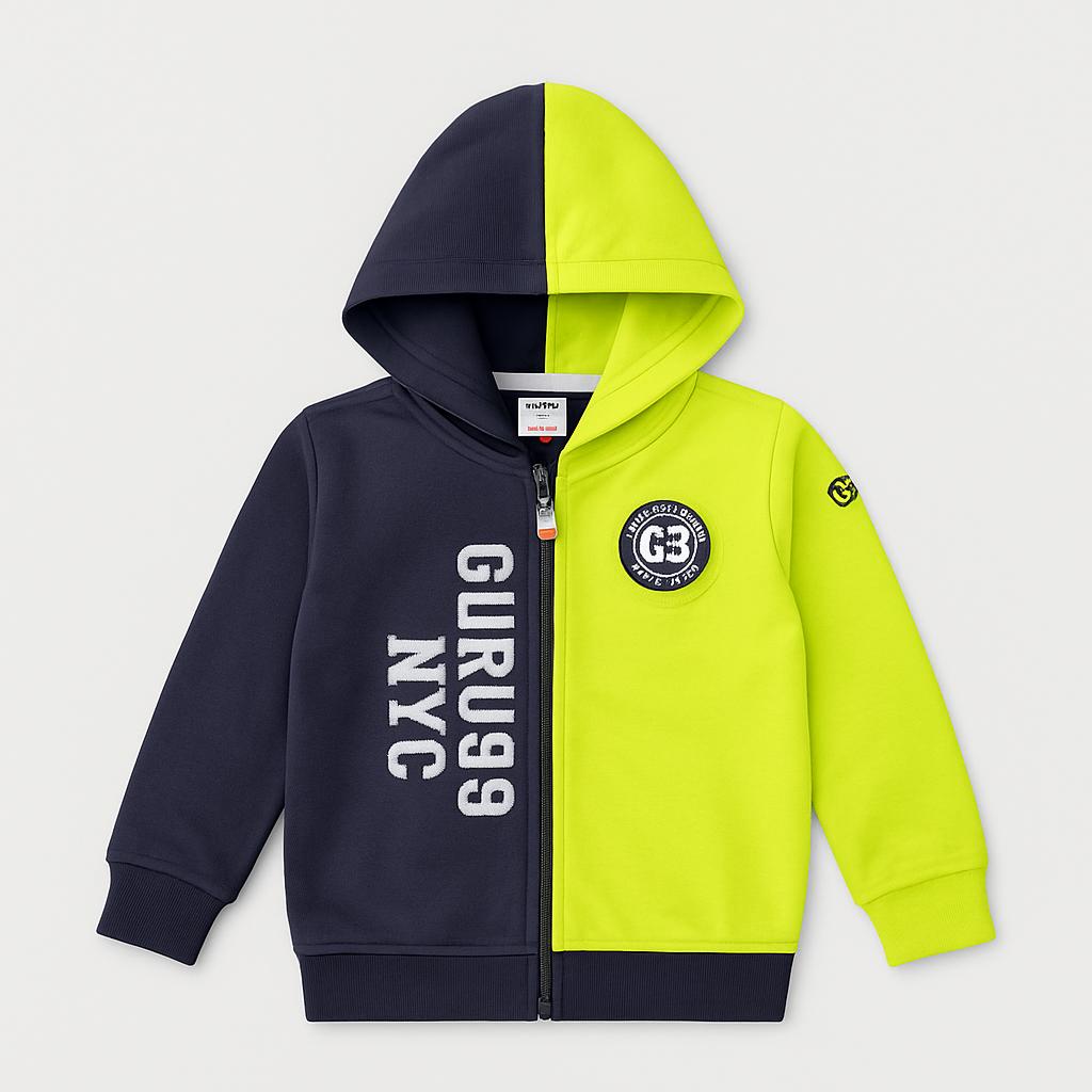 Questa vivace felpa di marca Guru99 aggiungerà un tocco di stile al guardaroba del tuo bimbo! Con un audace design bicromatico, presenta una metà in un raffinato blu scuro e l’altra in un brillante verde lime. La chiusura con zip e il cappuccio la rendono perfetta per le fresche giornate autunnali. La scritta “GURU99 NYC” sul lato blu aggiunge un elemento di urban style. Nonostante sia un capo usato, si presenta in buone condizioni e offre comfort e praticità per tutte le avventure quotidiane. Questa felpa è l'ideale per i piccoli trendsetter!