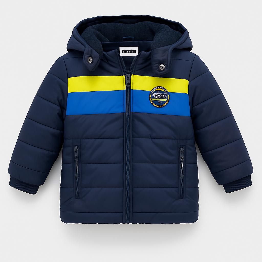 Questo giubbotto caldo e avventuroso è perfetto per accompagnare i tuoi piccoli nelle giornate invernali! Realizzato in un caldo tessuto imbottito, si presenta in una bella tonalità di blu navy. La vivace banda gialla e blu sul petto aggiunge un tocco sportivo e moderno, mentre il cappuccio permette di affrontare il freddo con stile. Con dettagli pratici come le tasche laterali e la chiusura con zip, è ideale per esplorazioni all'aperto. Nonostante sia un capo usato, si trova in ottime condizioni e può diventare il compagno di avventure preferito del tuo bambino!