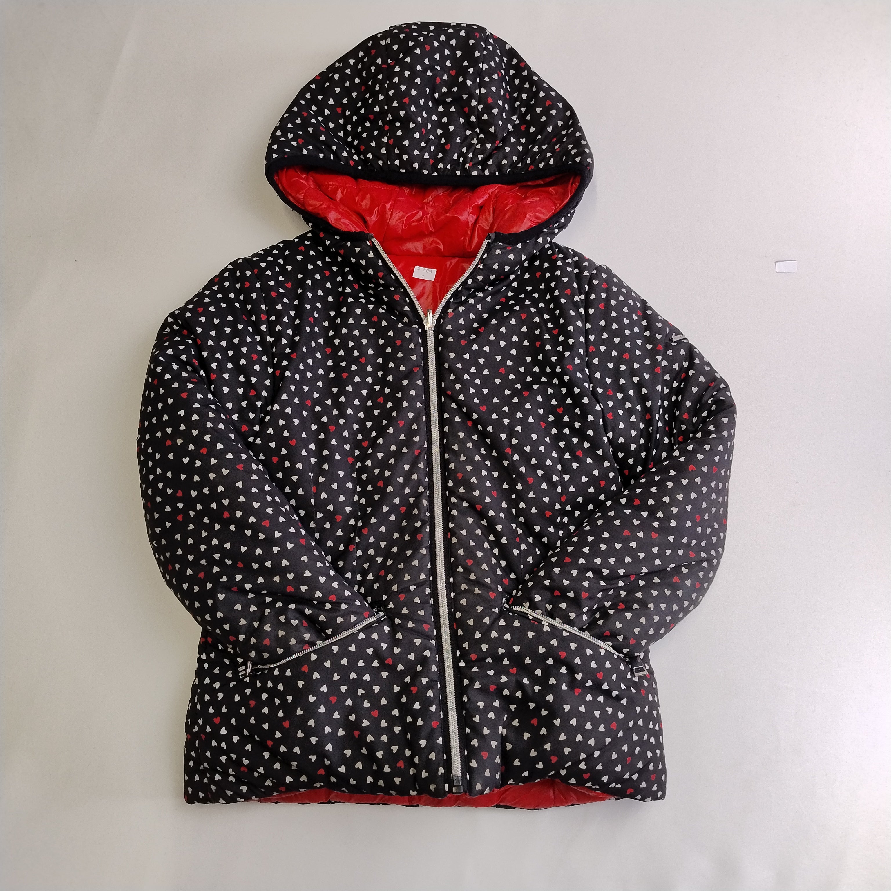Questo stupendo piumino con cappuccio è perfetto per tenere al caldo le piccole esploratrici durante l'inverno! Con un vivace motivo a cuori bianchi e rossi su sfondo nero, porta un tocco di dolcezza e allegria. La fodera rossa interna non solo aggiunge un dettaglio di stile, ma offre anche comfort extra. La chiusura frontale con zip rende il vestirsi un gioco da ragazzi. Leggero ma caldo, questo giubbotto usato è in ottime condizioni e pronto per accompagnare le avventure invernali delle bambine. Un capo irresistibile per affermare il proprio stile anche nelle fredde giornate!