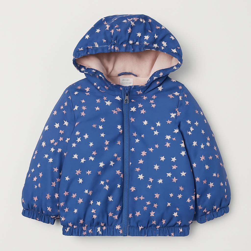 Questo incantevole giubbotto azzurro con stelle rosa è perfetto per le piccole esploratrici! Realizzato in materiale leggero e resistente, offre comfort e protezione nelle giornate più fresche. La fodera morbida e la cintura elastica ai polsi garantiscono calore e ottima vestibilità. Con il suo design vivace, questo cappottino renderà ogni outfit più allegro e divertente. Nonostante sia un capo usato, è in ottime condizioni e pronto per accompagnare nuove avventure all'aria aperta!