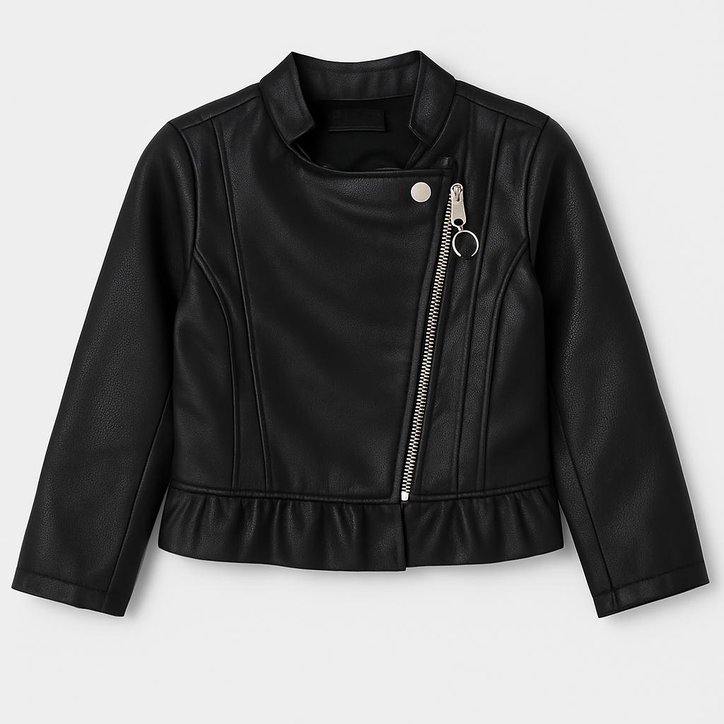Questa fantastica giacca in ecopelle nera è un must-have per le piccole ribelli con stile! Con il suo design elegante e moderno, presenta una chiusura diagonale con zip e un adorabile dettagliò a rouches in fondo, che aggiunge un tocco di femminilità. Le maniche lunghe e il collo alto la rendono perfetta per le serate fresche o per completare look audaci. Nonostante sia un capo usato, è in ottime condizioni e pronta a dare nuova vita al guardaroba delle piccole fashioniste! Ideale per combinazioni sia casual che più ricercate, farà sentire ogni piccola pronta per qualsiasi avventura!
