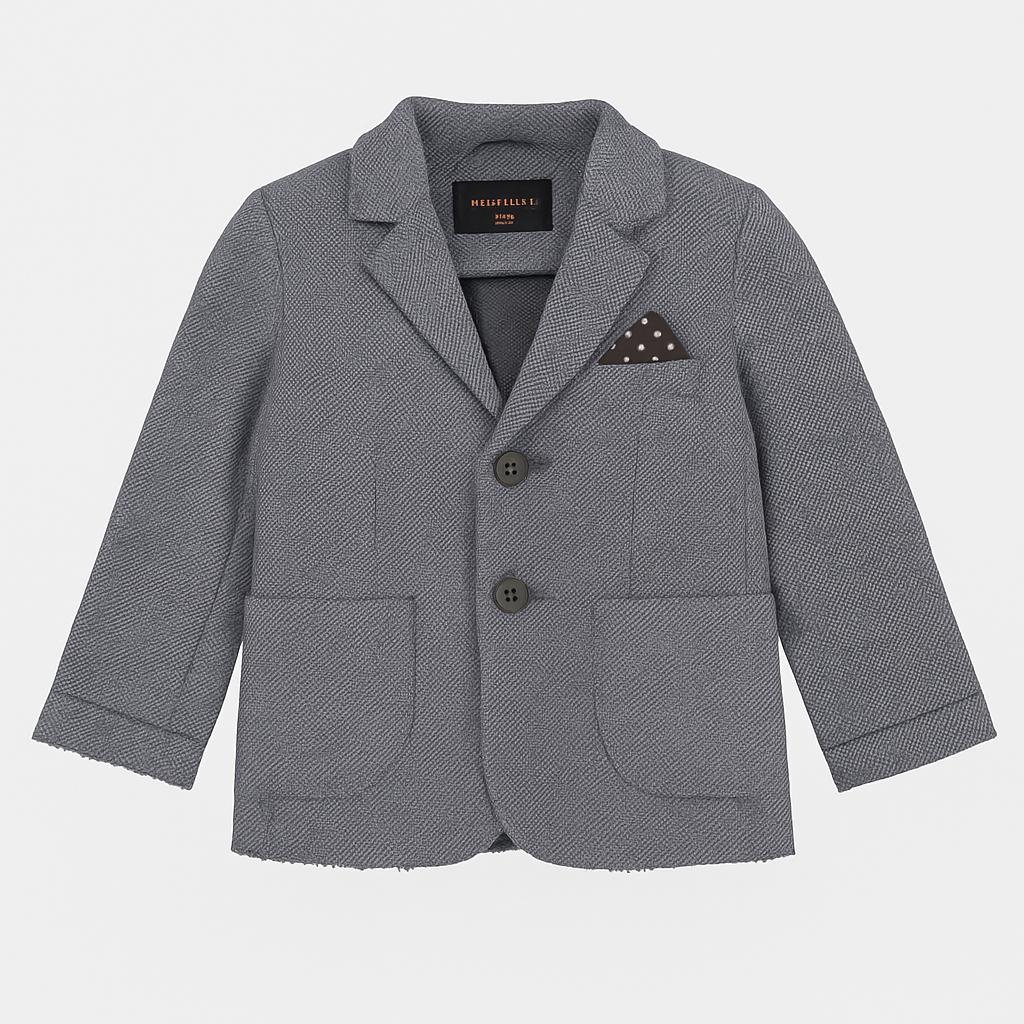 Questo elegante blazer per bambini è il capo perfetto per le occasioni speciali! Realizzato in un tessuto morbido e dalla trama raffinata, presenta un raffinato motivo a righe. I due bottoni sul davanti aggiungono un tocco di classe, mentre le tasche frontali, e il fazzoletto coordinato, completano l'aspetto sofisticato. Il taglio moderno e ben definito lo rende ideale per un look smart-casual, perfetto per festeggiamenti, matrimoni o eventi eleganti. Nonostante sia un capo usato, si trova in ottime condizioni e porterà stile e classe al guardaroba del tuo piccolo!
