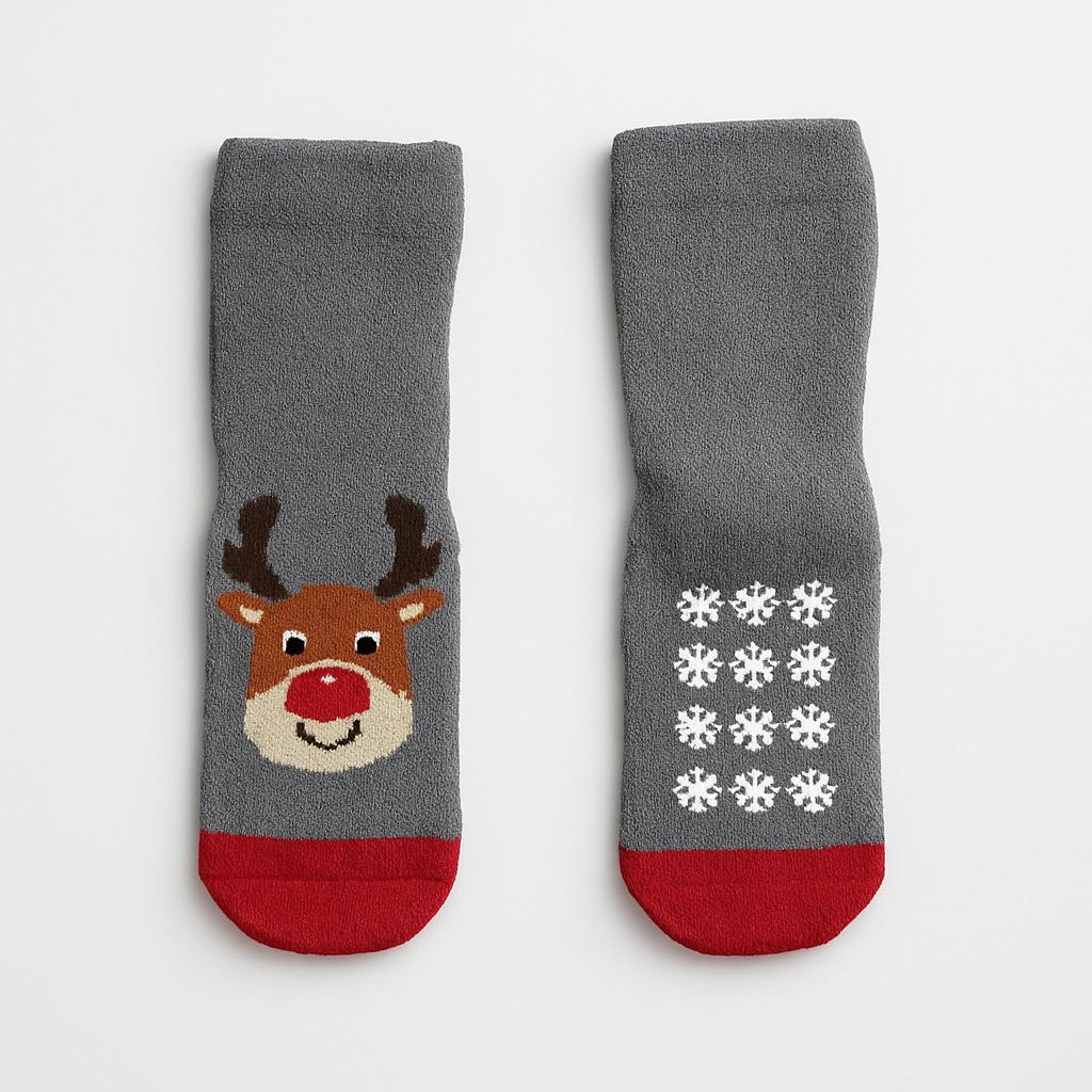 Queste calze grigie in morbido materiale sono perfette per tenere i piedini al caldo durante l'inverno! Con un simpatico motivo raffigurante una renna sorridente e dettagli rossi che richiamano il Natale, queste calze porteranno un sorriso sul volto di ogni bambino. Inoltre, la suola antiscivolo garantirà stabilità e sicurezza mentre si gioca e si corre in casa. Usate ma in ottime condizioni, sono un accessorio ideale per le festività e non solo, rendendo ogni outfit ancora più divertente!