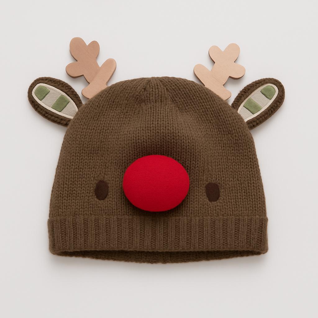 Questo adorabile cappellino da renna renderà il Natale ancora più speciale per il tuo bambino! Realizzato in morbido filato marrone, è decorato con un grande naso rosso e piccole corna di legno che lo rendono irresistibile. Le orecchie verdi aggiungono un tocco festivo, perfetto per le avventure invernali. Nonostante sia un capo usato, è in ottime condizioni e pronto a regalare calore e sorrisi. Un accessorio imperdibile per le giornate di festa e i giochi all'aperto!