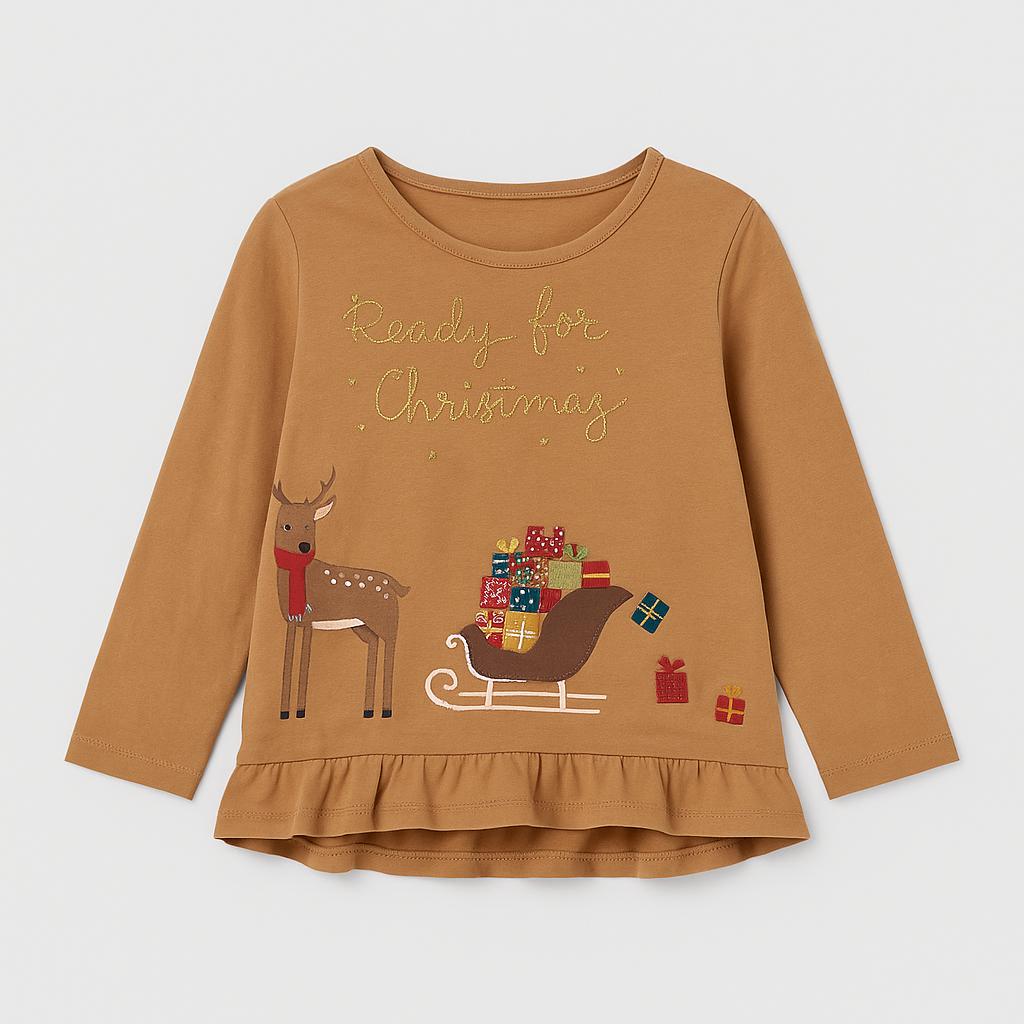 Questa adorabile maglietta a maniche lunghe è perfetta per le festività! Realizzata in un morbido tessuto beige, presenta una graziosa stampa con un simpatico renna che traina una slitta carica di regali colorati. La scritta "Ready for Christmas" brilla con una delicata doratura, aggiungendo un tocco festivo. Il design a tunica con orlo arricciato rende questo capo non solo comodo, ma anche alla moda per le piccole durante le celebrazioni invernali. Nonostante sia usata, è in ottime condizioni e pronta per rendere il Natale ancora più speciale!