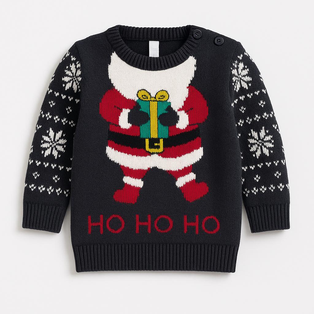 Preparati a entrare nel magico spirito natalizio con questo adorabile maglione di Natale! Realizzato in morbido tessuto, offre comfort e calore per le fredde giornate invernali. Il design presenta un vivace Babbo Natale che danza con un regalo, accompagnato dalla scritta “HO HO HO”, rendendolo perfetto per le festività. Le maniche decorate con motivi classici aggiungono un tocco festoso. Questo pezzo usato è in ottime condizioni, pronto per essere indossato da piccoli sognatori. Un must-have per le celebrazioni di dicembre!