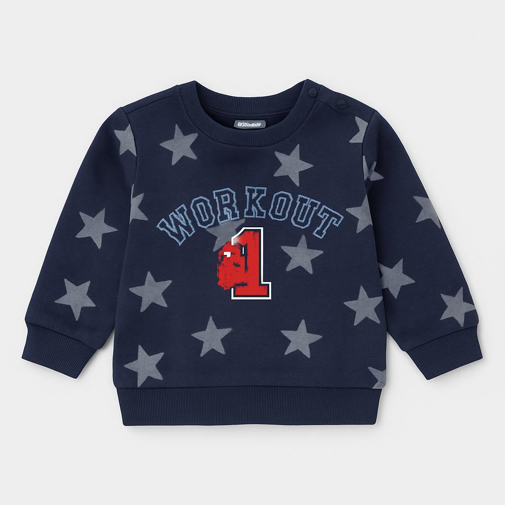 Questo delizioso maglione per bambini, con il suo morbido tessuto blu scuro, è perfetto per i piccoli sportivi in erba! Decorato con stelle grigie e una vivace stampa "WORKOUT 1", aggiunge un tocco di energia e divertimento a qualsiasi outfit. Le maniche lunghe garantiscono calore e comfort, mentre il colletto a giro rende facile indossarlo. Nonostante sia un capo usato, si presenta in ottime condizioni, pronto per accompagnare le avventure quotidiane. Un must-have per i piccoli che amano giocare con stile!