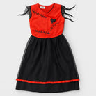 Questo incantevole vestito per bambine è perfetto per piccoli fantasmi e streghe! Con il suo vivace colore rosso e il gioco di trasparenze del tulle nero, cattura immediatamente l'attenzione. La parte superiore è caratterizzata da dettagli in stile spooky, con ricami che aggiungono un tocco di mistero. Le maniche leggere e vaporose donano un look elegante e giocoso, perfetto per feste a tema o per travestimenti in qualsiasi occasione. Nonostante sia un capo usato, si presenta in ottime condizioni, pronto a regalare ore di divertimento a ogni piccola principessa!