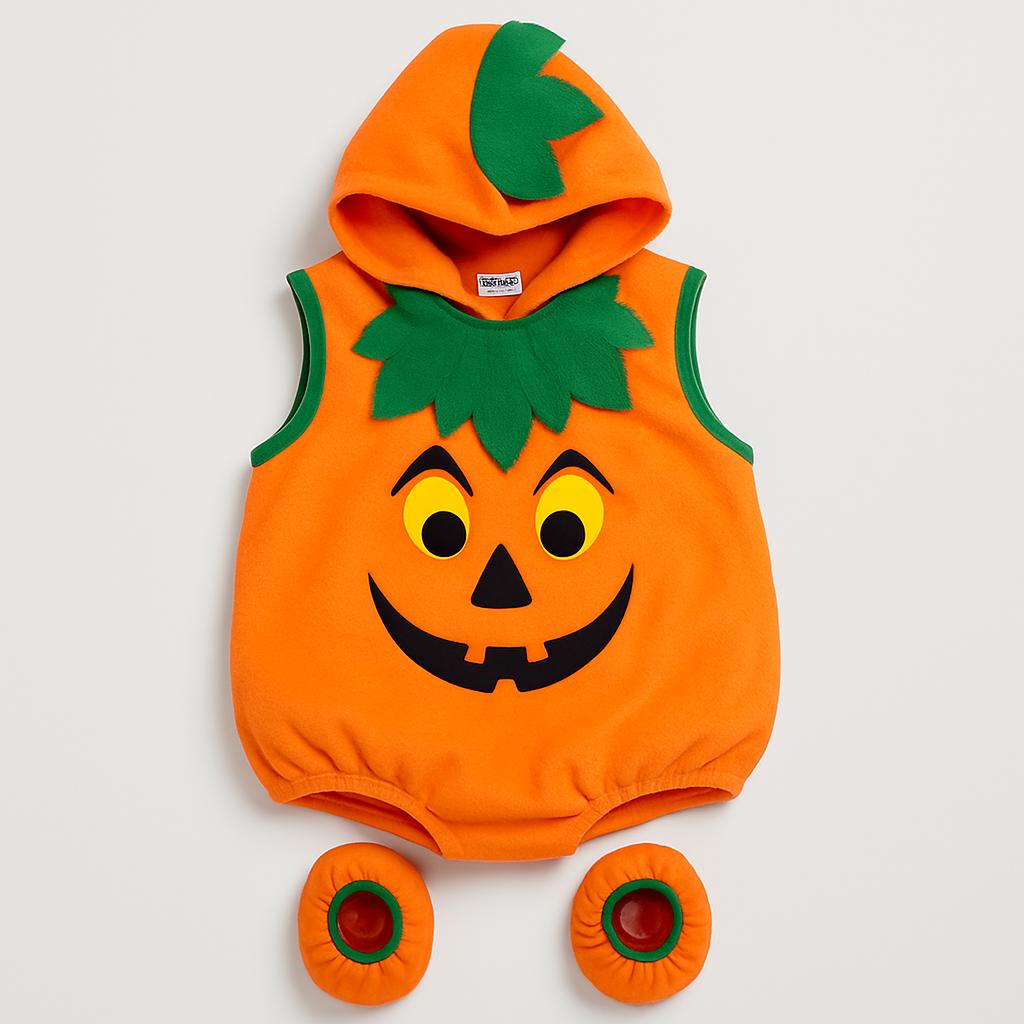 Preparati a festeggiare Halloween con questo adorabile costume da zucca! Realizzato in morbido pile arancione, questo completo rende ogni piccola streghetta o mostriciattolo il protagonista della festa. Con un divertente cappuccio decorato da foglie verdi e un viso simpatico stampato, il look è completato da pantaloni coordinati con una pratica elastico alla caviglia. Perfetto per scattare foto spettrali o per dolcetto o scherzetto! Anche se usato, è in ottime condizioni e porterà un sorriso a tutti. Un'idea da non perdere per un Halloween indimenticabile!