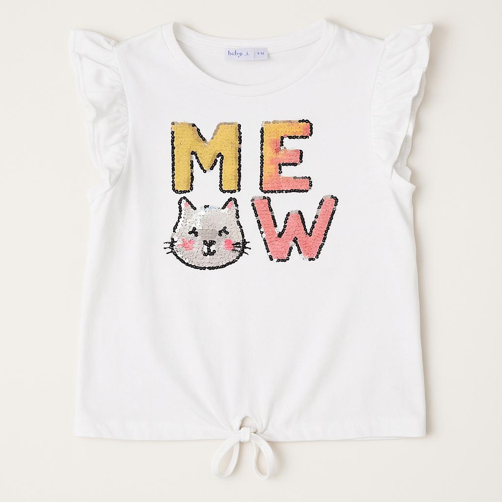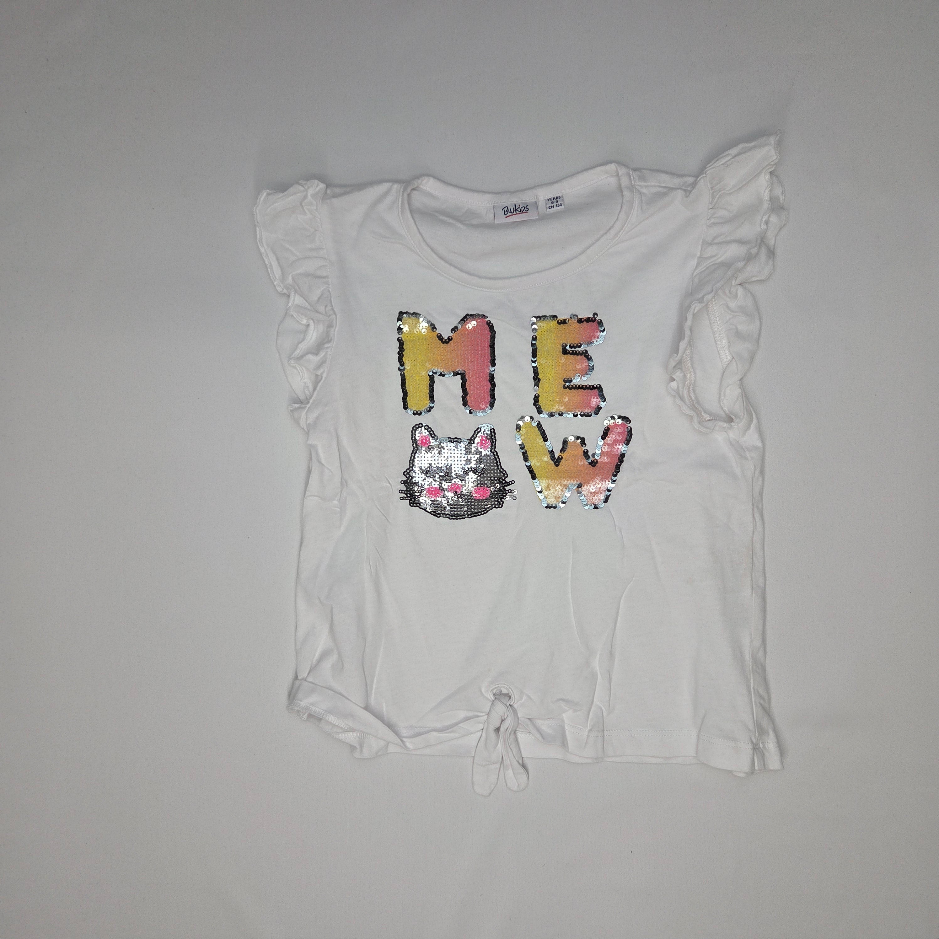 Questa adorabile t-shirt bianca è il sogno di ogni piccola amante dei gatti! Con la sua scritta "MEW" in paillettes luccicanti e un dolce viso di gatto, aggiunge un tocco giocoso e scintillante a qualsiasi outfit. Le maniche a volant conferiscono un tocco di femminilità, mentre il pratico nodo anteriore la rende perfetta per le avventure estive. Nonostante sia stata utilizzata, è in ottime condizioni e pronta per essere indossata da una piccola fashionista. Un must-have per le giornate all'insegna del divertimento!