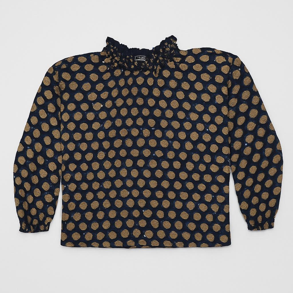 Questa graziosa blusa a maniche lunghe è perfetta per le piccole sognatrici! Caratterizzata da un vivace motivo a pallini dorati su fondo blu navy, aggiunge un tocco di eleganza al guardaroba. Il colletto arricciato e i polsini elasticizzati conferiscono un delicato stile romantico, rendendola ideale per occasioni speciali o per una passeggiata nel parco. Nonostante sia un capo usato, si presenta in ottime condizioni, pronto per essere indossato da una piccola trendsetter. Un'ottima scelta per chi ama esprimere la propria unicità con stile!