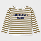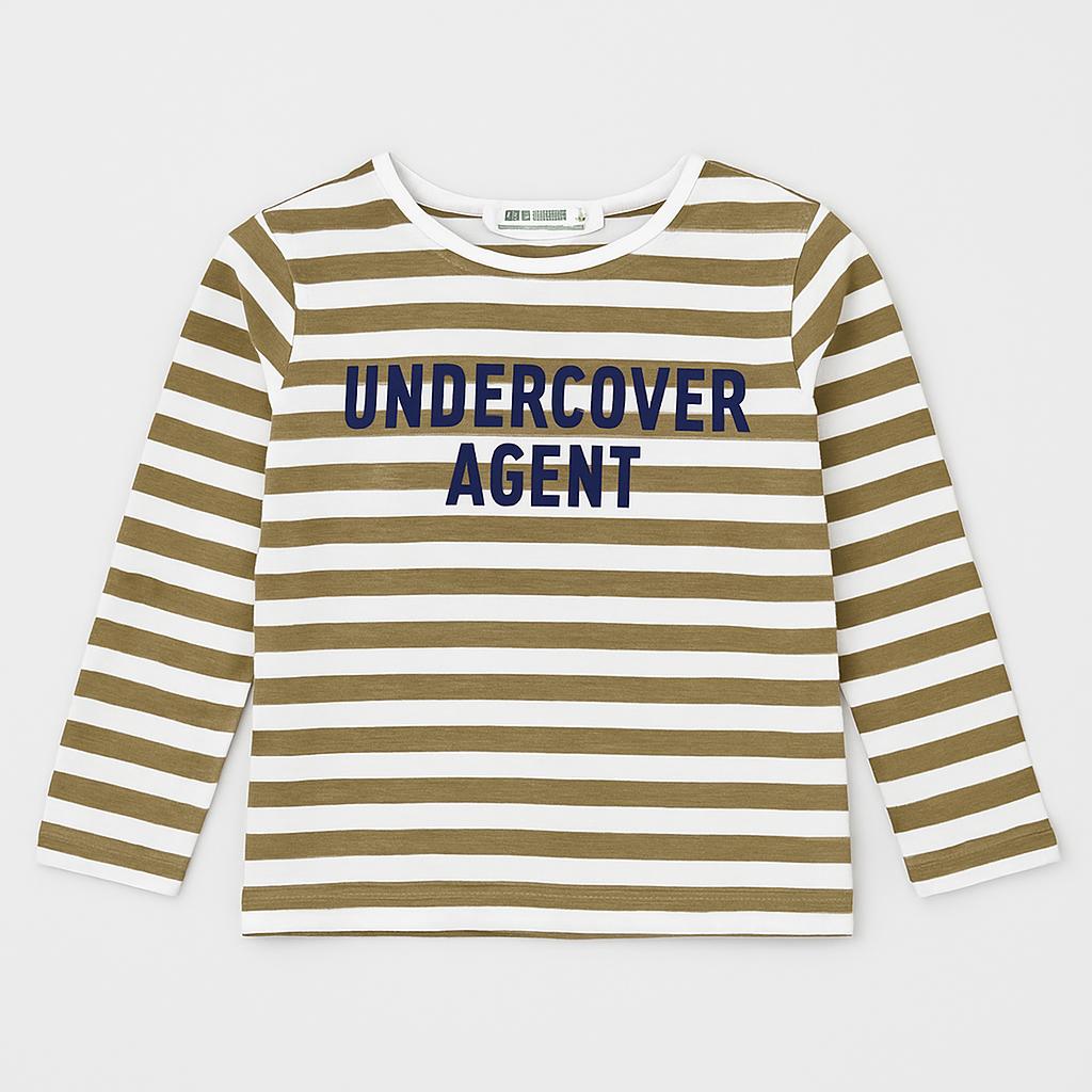 Scopri questa simpatica t-shirt a righe, perfetta per i piccoli esploratori! Realizzata in morbido cotone, presenta un design chic con righe bianche e verde oliva. Sul davanti, la scritta "UNDERCOVER AGENT" in blu scuro aggiunge un tocco di avventura. Le maniche lunghe la rendono ideale per le giornate più fresche, assicurando comfort e stile. Leggermente usata, è in ottime condizioni e pronta per vivere nuove avventure! Un must-have nel guardaroba di ogni piccola spia alla moda!