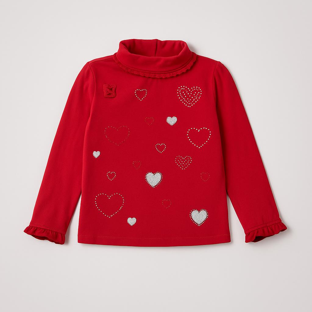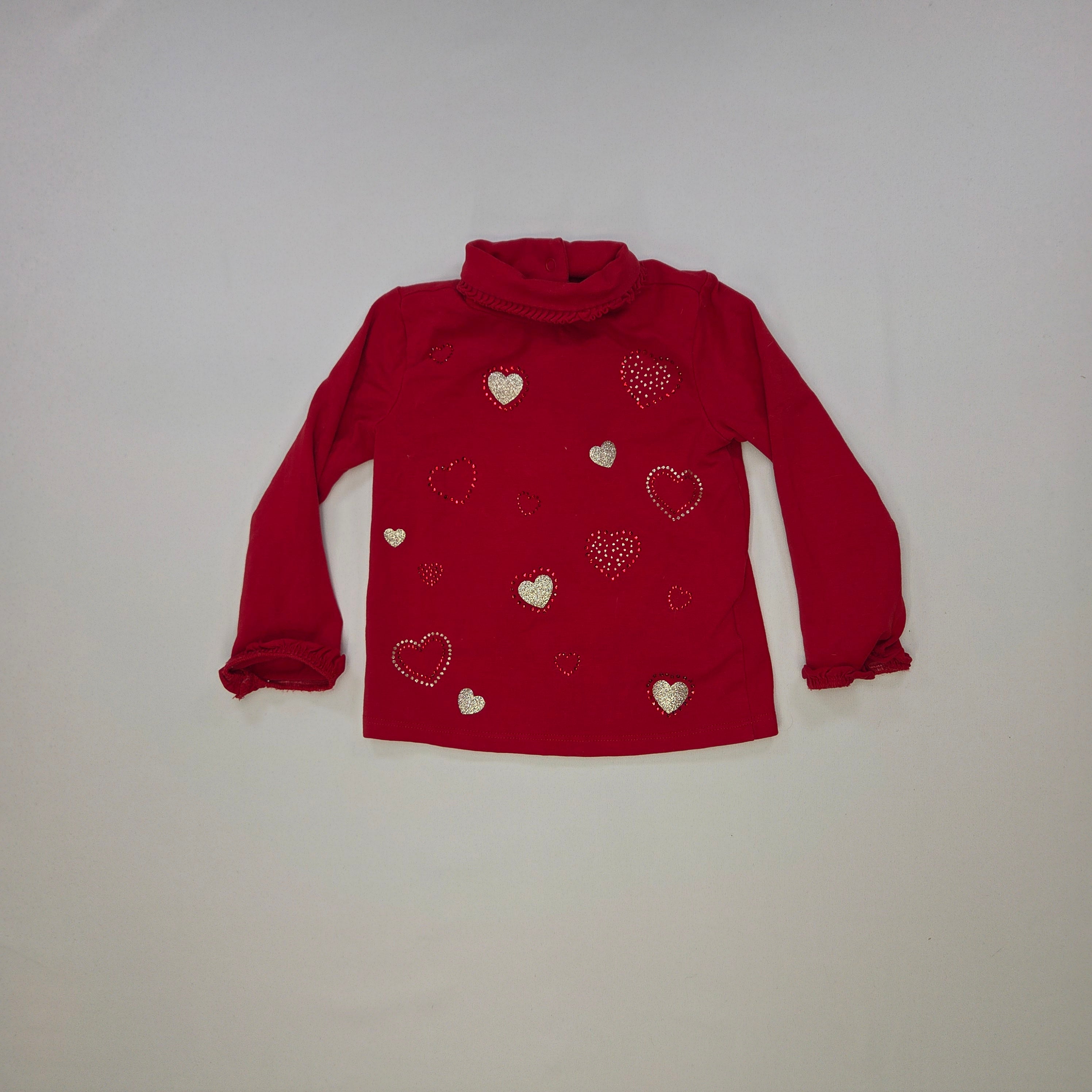 Questa irresistibile maglietta rossa è perfetta per le piccole romantiche! Realizzata in un tessuto morbido e caldo, presenta una graziosa scollatura alta che aggiunge un tocco di eleganza. Sul fronte, è decorata con cuori luccicanti, che brillano in un gioco di luci e colori, rendendo questo capo davvero speciale. Le maniche lunghe e le rifiniture arricciate offrono comfort e stile, perfetti per una giornata di giochi o un'uscita con la famiglia. Nonostante sia un capo usato, si presenta in ottime condizioni, pronta a far battere il cuore della tua piccola!
