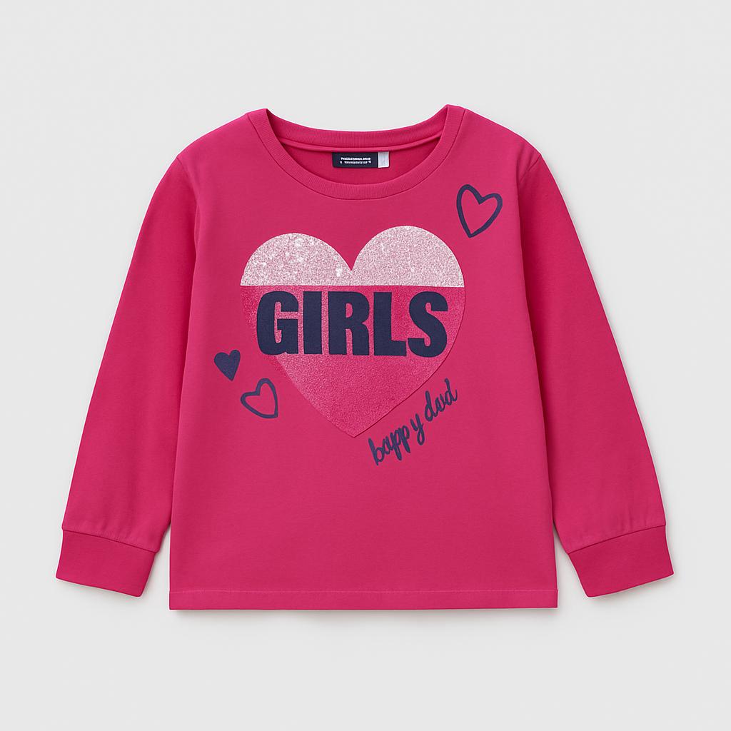 Questa tenera felpa rosa, con maniche lunghe, è perfetta per le piccole sognatrici! Decorata con un grande cuore luccicante e la scritta "GIRLS" in bold, questa maglietta trasmette tutto l'amore e la gioia di essere una ragazza. I dettagli a cuore aggiungono un tocco giocoso, mentre il morbido cotone garantisce comfort durante le avventure quotidiane. Ideale per le giornate fresche o per strati trendy, questo capo usato è in ottime condizioni e pronto a far brillare il guardaroba delle bambine! Un must-have per le piccole fashioniste!