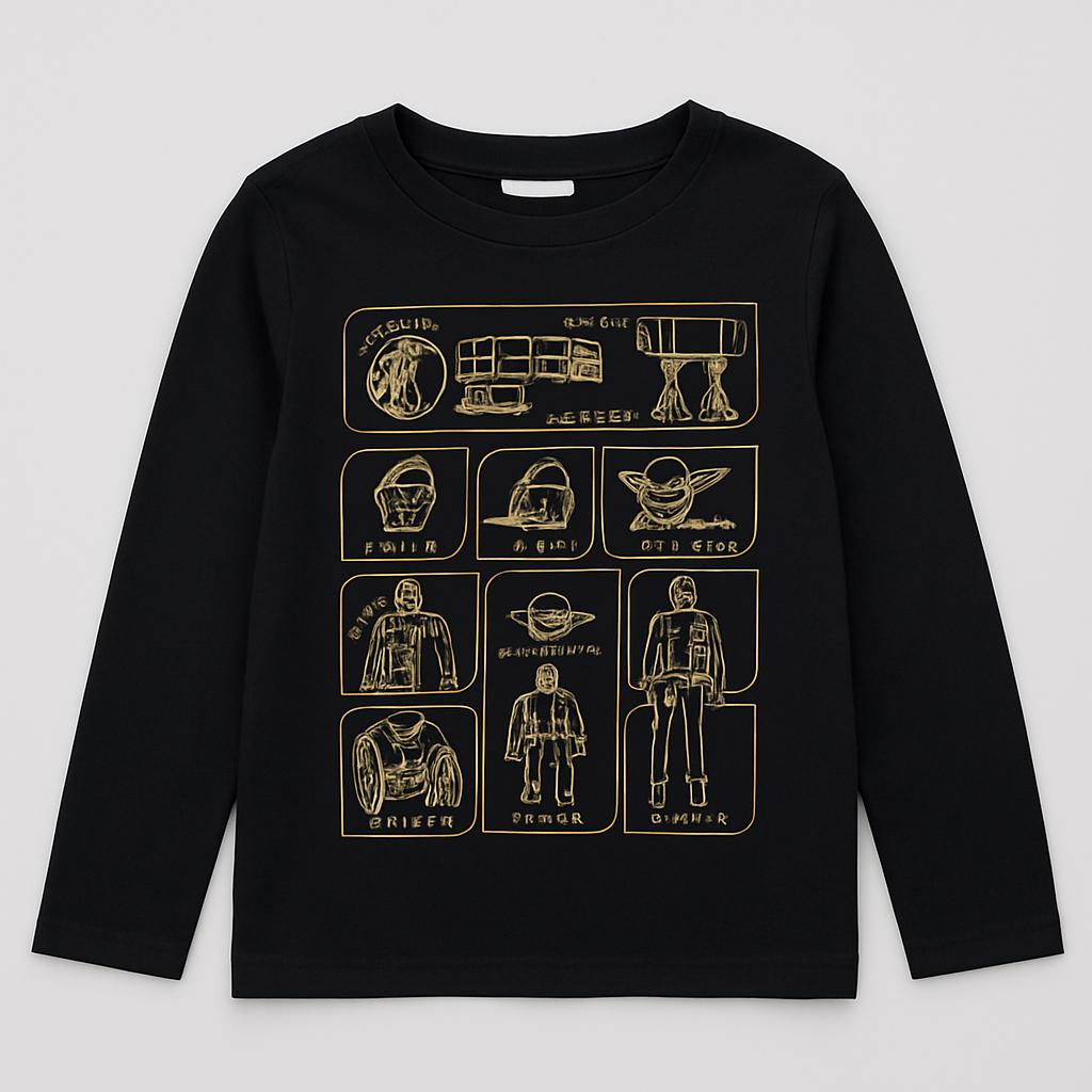 Questa fantastica maglietta a maniche lunghe in morbido cotone è perfetta per i piccoli fan delle avventure spaziali! Di color nero, è decorata da una vivace stampa dorata che presenta iconici personaggi e veicoli, ispirata al mondo di Star Wars. Il design divertente e audace aggiunge un tocco fantastico al guardaroba di ogni bambino. Il colletto tondo e le maniche lunghe la rendono ideale per le fresche serate primaverili, mentre il taglio comodo garantisce libertà di movimento per i giochi. Nonostante sia un capo usato, è in ottime condizioni, pronto a far brillare il look dei piccoli esploratori!