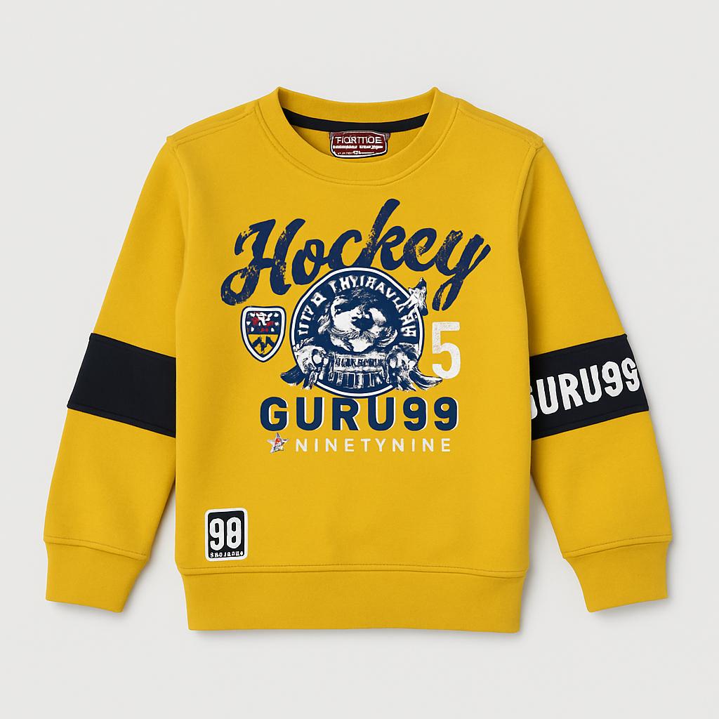 Questa felpa di marca GURU99 è un'aggiunta fantastica per il guardaroba del tuo piccolo campione! Realizzata in un caldo tessuto, si presenta in un vivace giallo senape che porterà un sorriso anche nelle giornate più grigie. La felpa è decorata con una simpatica grafica che richiama il mondo dell'hockey, con un adorabile personaggio che la rende unica. Le maniche lunghe e il colletto a giro renderanno ogni avventura comoda e alla moda. Nonostante sia un capo usato, è in ottime condizioni e perfetta per vestire un giovane sportivo con stile!