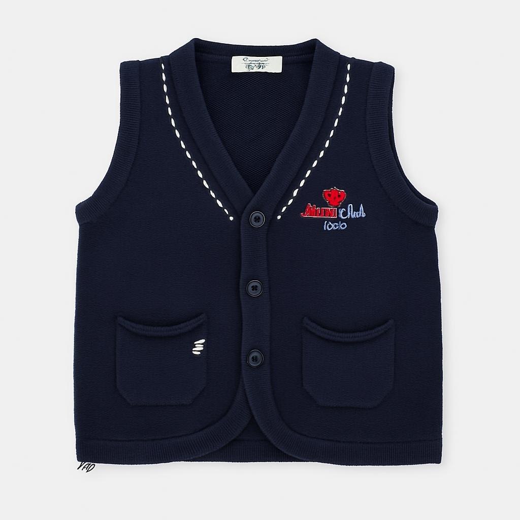 Questo simpatico gilet smanicato di marca Little Club è perfetto per le piccole occasioni! Realizzato in morbido filo di cotone di un elegante colore blu navy, aggiunge un tocco di classe al guardaroba del tuo bambino. Le rifiniture bianche donano un carattere particolare, mentre i bottoncini e le tasche sul davanti offrono un pratico dettaglio funzionale. Nonostante qualche piccolo segno di usura, si presenta in buonissime condizioni e pronto a regalare comfort e stile. Un capo versatile, ideale da abbinare a camicie o t-shirt per un look raffinato e giocoso!
