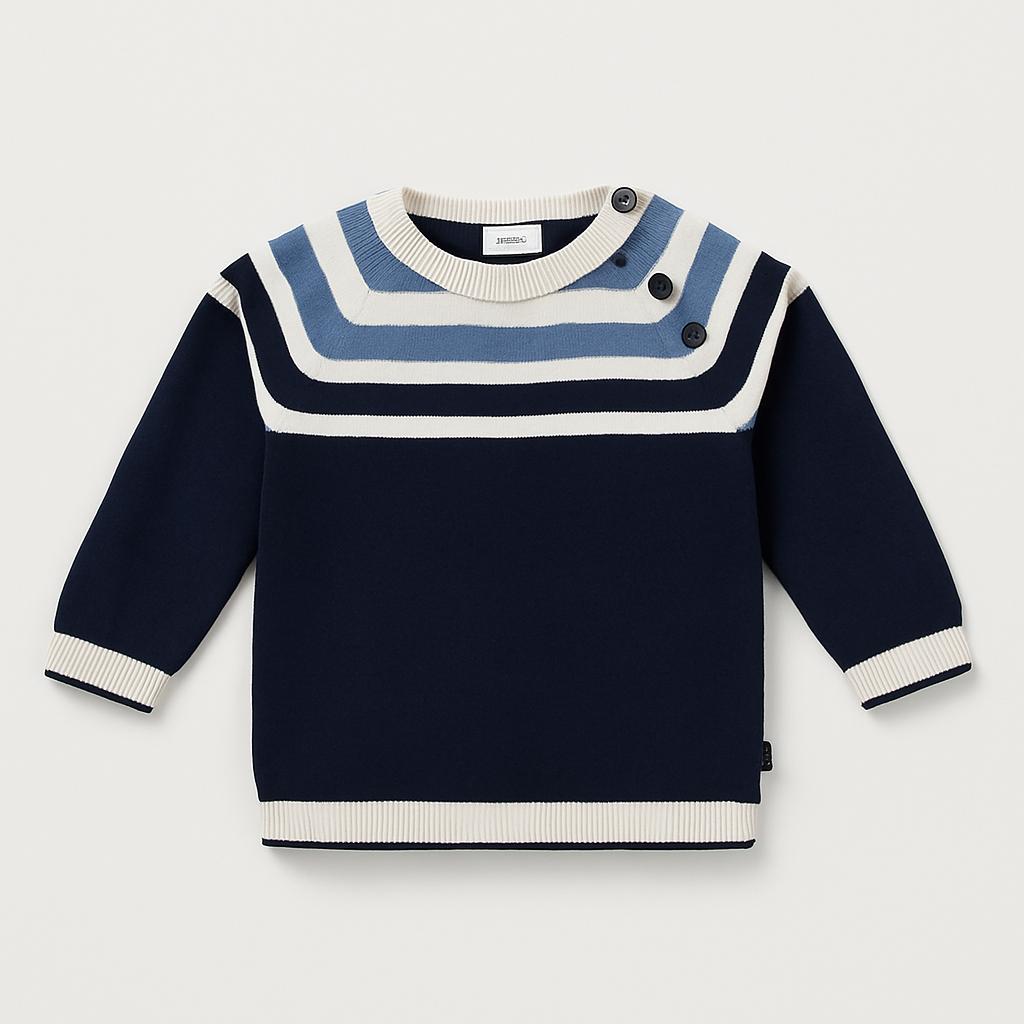 Questo adorabile maglione a righe è un must per il guardaroba invernale del tuo piccolo! Realizzato in un morbido e caldo tessuto, presenta una combinazione di blu navy e tonalità più chiare che donano un tocco di freschezza. Le righe orizzontali creano un design vivace e accattivante, perfetto per ogni occasione. I bottoni sul collo non solo aggiungono un dettaglio chic, ma rendono anche più facile indossarlo. Nonostante sia usato, questo maglione è in ottime condizioni, pronto per vestire tanti momenti di gioco e avventure!