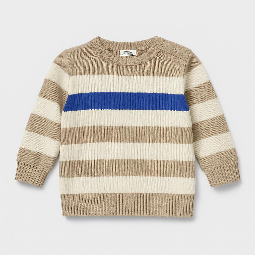 Questo delizioso pullover a righe è perfetto per tenere al caldo il tuo piccolo durante le fresche giornate! Realizzato in un morbido misto cotone, presenta eleganti righe beige e bianche, con un vivace dettaglio blu che dona un tocco di allegria. Le maniche lunghe e la scollatura a girocollo assicurano comfort e praticità, mentre il grazioso nodo sulla spalla aggiunge un elemento chic e originale. Anche se usato, si presenta in ottime condizioni, pronto per essere indossato e accompagnare le avventure quotidiane del tuo bambino! Un must-have per ogni guardaroba!