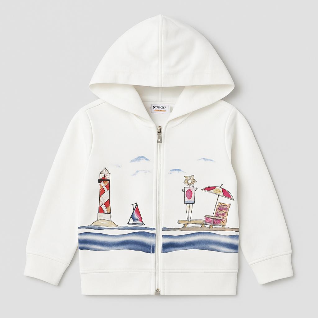 Questa adorabile felpa con zip bianca è perfetta per le giornate fresche! Completata da un vivace disegno che ritrae un faro e un’estate in spiaggia, trasmette un'atmosfera giocosa e spensierata. La comoda capuccio protegge dalle folate di vento, mentre il morbido tessuto offre calore e comfort. Anche se si tratta di un capo usato, è in ottime condizioni e pronto per accompagnare le piccole avventuriere nelle loro esplorazioni! Una felpa che trasforma ogni look in un viaggio verso il sole!