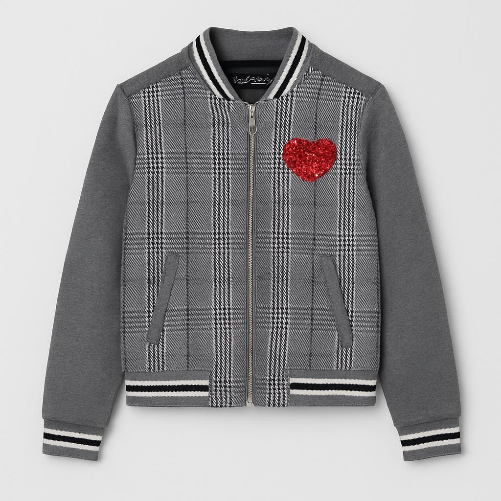 Questa giacca bomber da bambini è un capo irresistibile per ogni piccola fashionista! Realizzata in morbido tessuto grigio a scacchi, presenta dettagli sporty con bordi a righe bianche e nere. Ma il vero protagonista è il cuore scintillante di paillettes rosse, che aggiunge un tocco di magia e stile. Con la sua chiusura frontale e il taglio pratico, è perfetta per le avventure quotidiane e le giornate all'aperto. Anche se è un pezzo usato, si presenta in ottime condizioni, pronta per essere indossata. Un must-have nel guardaroba invernale!