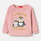 Questo dolcissimo pullover in morbido tessuto soffice è perfetto per le giornate autunnali! Di un delizioso colore rosa, presenta un adorabile ricamo con due pinguini, uno dei quali indossa una corona e un grande cuore. La scritta "LA PERFECTION C'EST DE FAMILLE" aggiunge un tocco di dolcezza e un messaggio affettuoso. Le maniche lunghe e il taglio ampio garantiscono comfort e libertà di movimento, ideali per le piccole che amano divertirsi. Questo capo usato è in ottime condizioni e sicuramente porterà un sorriso a chi lo indossa!