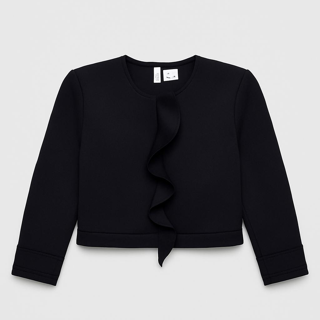Questo elegante cardigan nero è perfetto per le piccole che amano distinguersi! Realizzato in un tessuto morbido e leggermente elasticizzato, offre comfort e stile in ogni occasione. La delicata riga di volant lungo il centro aggiunge un tocco di femminilità, rendendolo ideale per eventi speciali o per completare un look alla moda. Le maniche lunghe lo rendono perfetto per le serate fresche, mentre la chiusura frontale assicura praticità. Nonostante sia un capo usato, presenta ottime condizioni, pronto a diventare il preferito nella routine quotidiana della tua piccola moda!