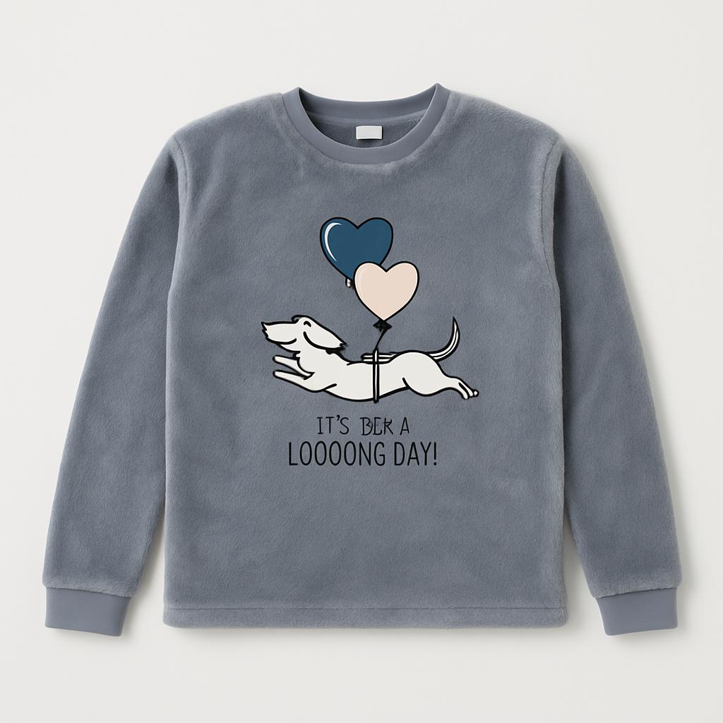 Questo morbido e coccoloso pullover in pile blu è l'ideale per le fredde giornate invernali! Caratterizzato da un adorabile design con un cagnolino che corre con palloncini, porta un sorriso anche nei momenti più grigi. La scritta "It's been a loooong day!" aggiunge un tocco di simpatia e leggerezza. Le maniche lunghe e il taglio comodo garantiscono il massimo della comodità durante le avventure quotidiane. Nonostante sia un capo usato, si presenta in ottime condizioni, pronto per essere indossato da un piccolo amante degli animali! Un must-have per le serate di relax e giochi domestici!
