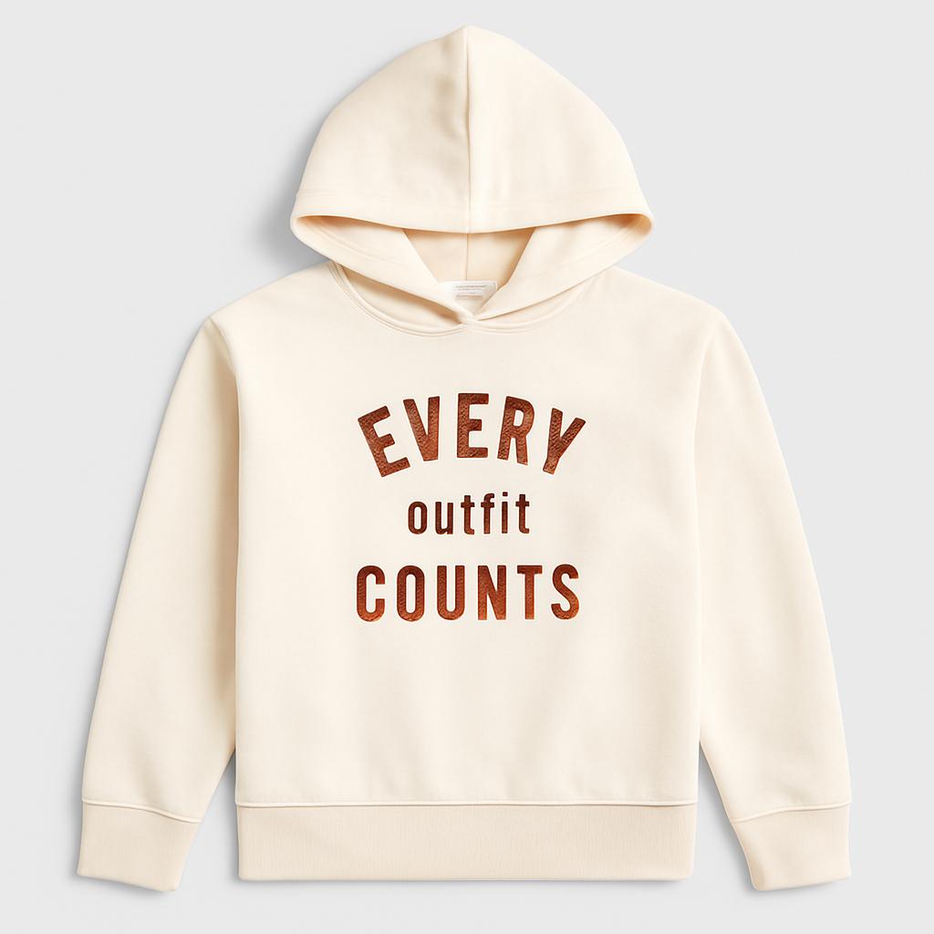 Questa dolce felpa con cappuccio è un'aggiunta fantastica al guardaroba dei più piccoli! Realizzata in un morbido tessuto di cotone beige, è perfetta per le fresche giornate autunnali. Sul davanti, la scritta “EVERY outfit COUNTS” in calde tonalità rosse aggiunge un messaggio positivo e trendy.