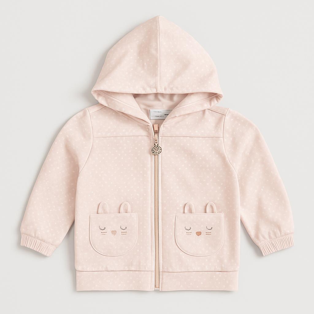 Questa adorabile felpa con cappuccio in un delicato rosa pallido è il capo perfetto per le piccole amiche dei coniglietti! Realizzata in morbido cotone, è decorata con graziosi pois bianchi e due teneri coniglietti ricamati sulle tasche frontali. La chiusura con zip e le maniche leggermente elastiche garantiscono comfort e facilità di movimento, ideali per le avventure quotidiane. Nonostante sia un capo usato, appare in ottime condizioni, pronto a portare un sorriso sul viso della tua piccola. Un'aggiunta dolce e pratica al suo guardaroba!