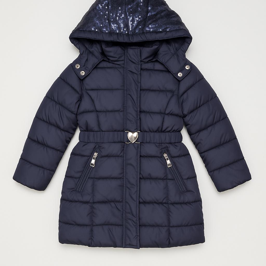 Questo caldo e affascinante cappotto invernale è perfetto per le piccole esploratrici! Realizzato in un resistente tessuto blu scuro, è imbottito per garantire comfort e calore durante le giornate fredde. La pelle sintetica del cappuccio, adornata con paillettes scintillanti, aggiunge un tocco di magia e stile a questo indumento. La cintura in vita permette di regolarsi per una vestibilità perfetta, mentre le tasche laterali sono ideali per riporre piccoli tesori. Nonostante sia un capo usato, si trova in ottime condizioni, pronto per accompagnare la tua bambina in tutte le sue avventure invernali!