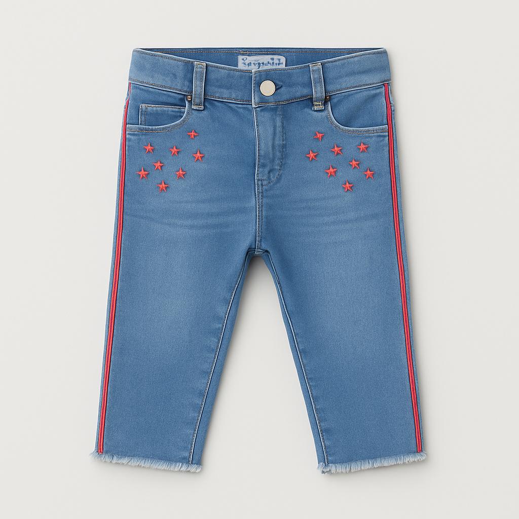 Questi jeans corti in denim azzurro sono un’aggiunta fantastica al guardaroba estivo dei più piccoli! Con un design trendy e un tocco di stile grazie ai dettagli di paillettes rosa, questi pantaloni si distincono per la loro originalità. Il taglio alla caviglia e l'orlo sfrangiato conferiscono un aspetto rilassato, perfetto per lunghe giornate di gioco. Nonostante siano usati, si presentano in ottime condizioni, pronti per nuove avventure. Comodi e alla moda, sono ideali per ogni piccola esploratrice!