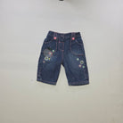 Questi adorabili pantaloni in denim sono perfetti per le piccole esploratrici! Con un eleganti tonalità di blu scuro, presentano un morbido elastico in vita che garantisce comfort e praticità. La parte frontale è decorata con frizzanti fiori ricamati, che aggiungono un tocco di colore e allegria al look. La lunghezza corta li rende ideali per le calde giornate estive e per divertirsi all'aperto. Nonostante siano usati, i pantaloni si trovano in ottime condizioni, pronti per accompagnare ogni avventura della tua bimba! Un capo versatile e trendy per ogni guardaroba infantile!