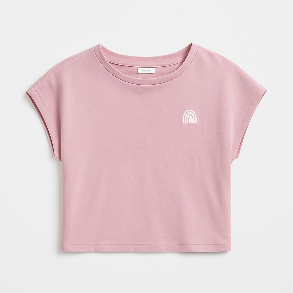 Questo adorabile crop top rosa è perfetto per le piccole fashioniste che amano esprimere il loro stile unico! Realizzato in un morbido cotone, offre comfort e freschezza per tutta la giornata. La manica corta e il taglio alla moda lo rendono ideale per creare look estivi chic. Aggiunto al design, un simpatico arcobaleno ricamato sul fronte, che porta un tocco di allegria e positività. Nonostante sia un capo usato, si presenta in eccellenti condizioni, pronto per essere indossato in mille avventure! Un must-have nel guardaroba estivo delle bimbe!