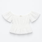 Questa adorabile blusa bianca è la scelta perfetta per le piccole sognatrici! Realizzata in un tessuto leggero e fresco, presenta un delizioso design con spalle scoperte e maniche a campana, che donano un tocco di eleganza e freschezza. La delicata decorazione con ricami a forma di occhielli conferisce un aspetto romantico, ideale per le occasioni speciali o per passeggiate estive. Nonostante sia un articolo usato, si presenta in ottime condizioni, pronto a far brillare il guardaroba della tua bambina con il suo charme e stile unico!