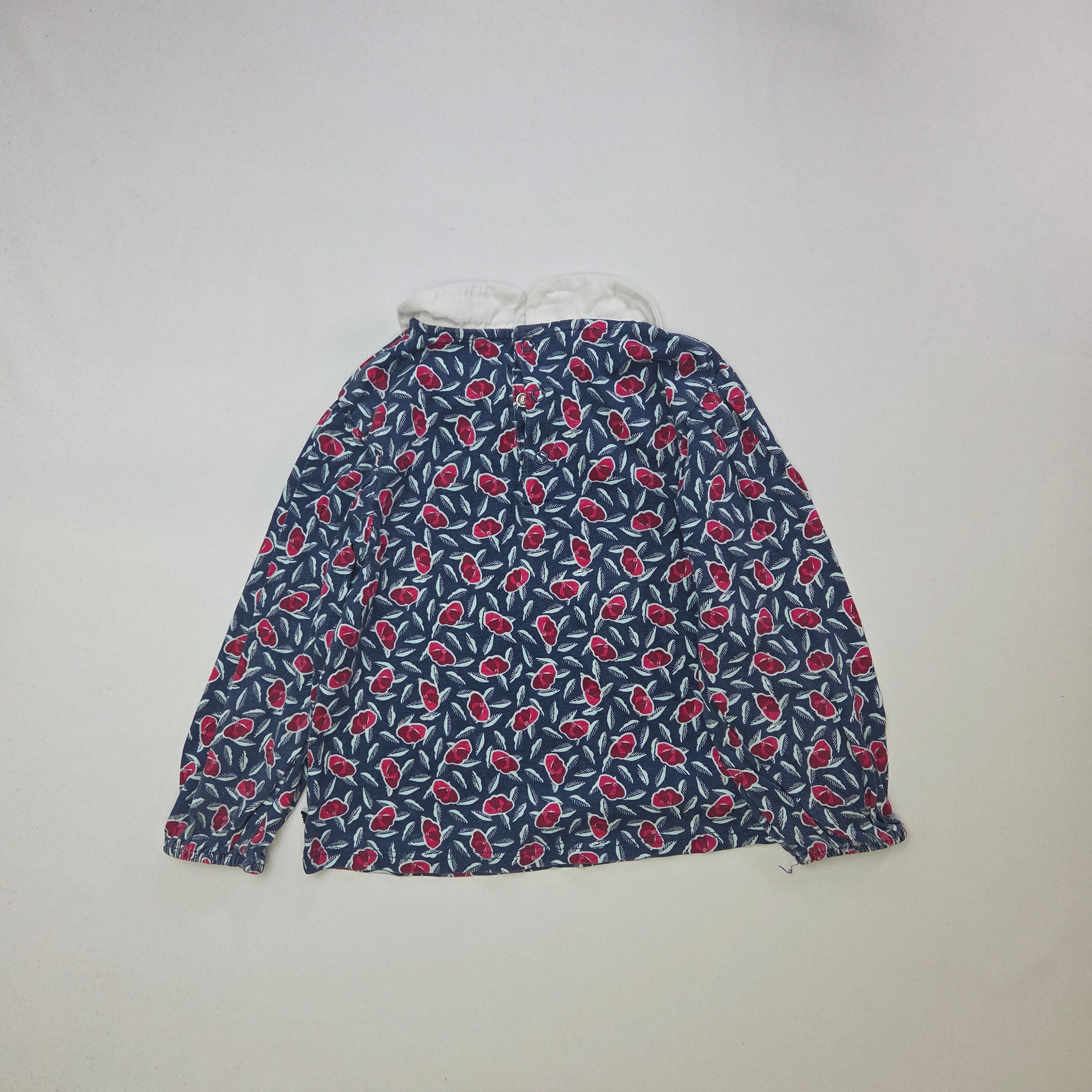 Questa deliziosa blusa presenta un romantico design floreale che farà innamorare anche le piccole più esigenti! Realizzata in morbido cotone, offre un comfort ineguagliabile. Il colletto bianco crea un dolce contrasto con il fondo blu, rendendo il capo perfetto per ogni occasione. Le maniche lunghe con dettagli arricciati aggiungono un tocco di eleganza, rendendola ideale per le giornate fresche. Nonostante sia un capo usato, si presenta in ottime condizioni, pronta ad accompagnare le avventure della tua piccola in stile!