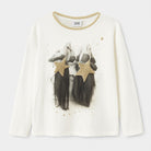 Questa dolce maglietta a maniche lunghe è perfetta per le piccole sognatrici! Realizzata in morbido cotone bianco, presenta un'affascinante stampa sul retro che ritrae tre ballerine, pronte a danzare sotto un cielo di stelle dorate. Il tocco scintillante delle stelle e dei fiocchi sulle ballerine aggiunge un pizzico di magia al look. La scollatura decorata rende questa maglietta ideale per occasioni speciali o per una giornata di giochi. Un capo usato ma in ottime condizioni, perfetto per far brillare il guardaroba delle giovani amanti della danza e della moda!