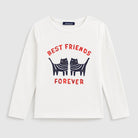 Questa adorabile maglietta a maniche lunghe è perfetta per le piccole amiche che amano la compagnia dei loro amici felini! Di un delizioso colore bianco, il design presenta due gattini simpatici e la scritta "BEST FRIENDS FOREVER" in rosso, che catturerà sicuramente l'attenzione. Realizzata in un morbido cotone, offre comfort e traspirabilità per tutte le avventure giornaliere. Nonostante sia un capo usato, si trova in ottime condizioni, pronta per essere indossata durante giochi, uscite o momenti di svago. Un'aggiunta imperdibile al guardaroba delle vostre piccole!