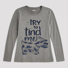 Questa simpaticissima maglietta a maniche lunghe di marca MSK è perfetta per i piccoli esploratori! Realizzata in morbido cotone grigio, offre comfort e calore per le giornate fresche. Il suo design accattivante presenta una grande scritta "Try to find me" con un giocoso motivo camo blu che stimola la fantasia. Questo capo usato è in ottime condizioni e aggiunge un tocco divertente al guardaroba dei tuoi bimbi. Perfetta per avventure all'aperto o per momenti di gioco in casa, questa maglietta farà brillare il loro stile!